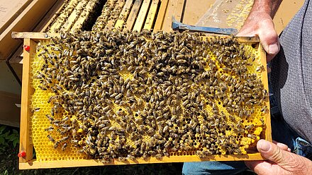 Wir können bei unseren sanftmütigen Bienen immer ohne Schutzkleidung arbeiten, auch die Kinder.