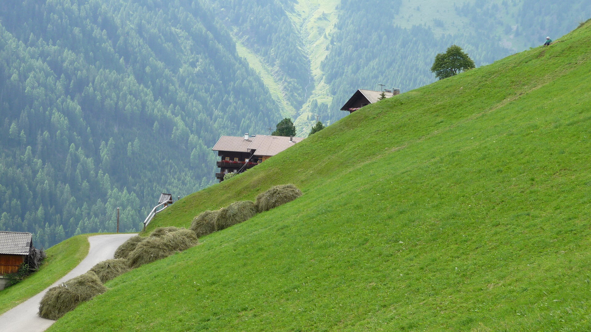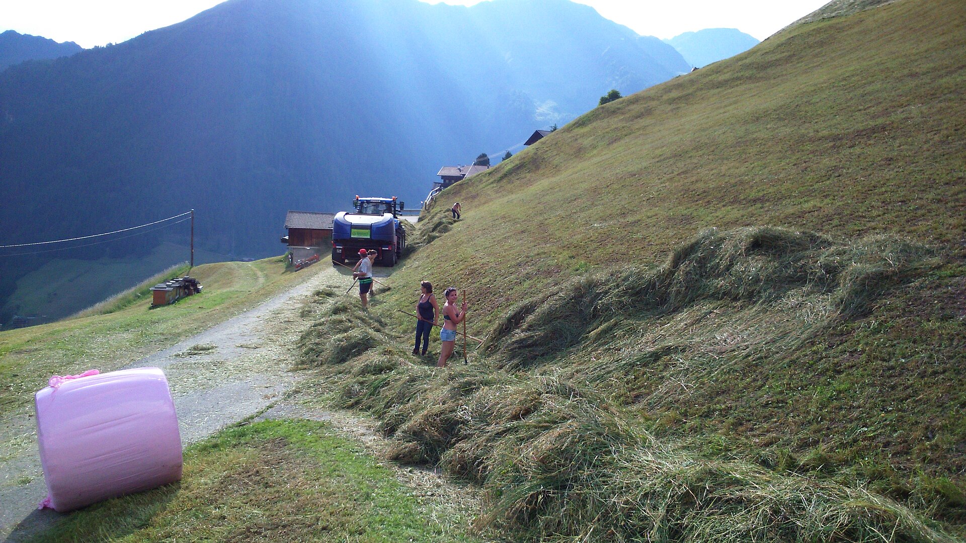 Die Gesamtfläche unseres kleinen Betriebes ist 18 ha (Wald und Grünland). Die Heimfläche am Bauernhof und die Almwiese auf der Unterstalleralm werden 2-mal gemäht. Bei uns bleiben moderne Maschinen großteils in der Garage – Handarbeit steht auf der Tagesordnung. Aufgrund der überaus steilen Hänge ist das Arbeiten mit Traktor & CO nicht möglich.